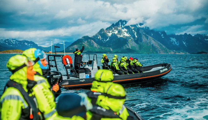 Experience the unique wonders of Lofoten on a comprehensive and condensed Lofoten RIB safari in the evening. Join us on a high-speed journey from Svolvær, through the dramatic archipelago and out across Vestfjorden. During the tour, you have great opportunities to observe majestic sea eagles in their natural habitat, all while being surrounded by Lofoten's iconic steep mountains and idyllic beaches.
