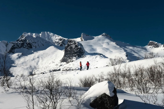 Været på vinteren i Lofoten skifter raskt, fra sol og fint vintervær til regn dagen etter. Vår tur tilpasses derfor etter føreforhold. Noen ganger vil trugene byttes ut med brodder, og ruten gjøres om. Det betyr lite for deg – turopplevelsen garanterer vi blir god uansett. Truger og staver tilpasses dere før vi setter kursen ut i marka. Turen tar ca 3 timer, avhengig av hvor vi velger å gå.